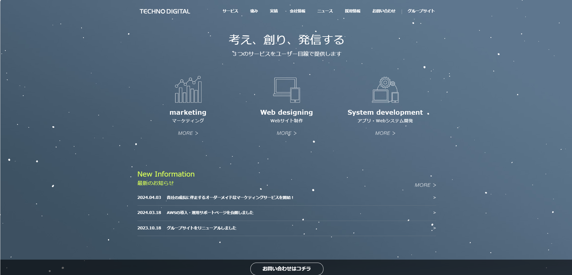 | 株式会社テクノデジタル | ・エンジニアが100人以上在籍している ・マーケティング戦略もWebサイト制作とともに一貫して対応 |