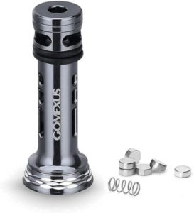 リールスタンドは、リールを地面に置いたときにリールにキズが付かないようにするアイテムです。リールハンドルの反対側に取り付けて、地面にリール本体が直接触れないよう支えになるパーツです。こちらの製品は内部にウェイトとスプリングがセットされており、重さのバランスの調節も可能です。