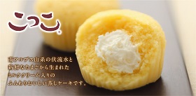 「こっこ」は30年以上にわたり静岡県民に愛されてきた蒸しケーキです。スポンジはきめが細かくふわふわの食感。焼いたスポンジとはちょっと違うしっとりさもあります。そしてスポンジとの相性ぴったり、ミルククリームのほんのり絶妙な甘さ。季節によって固さを変えるこだわりぶりです。