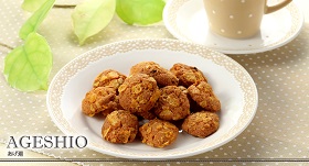 「あげ潮」は、ドライフルーツが練り込まれコーンフレークがトッピングされた軽い食感のクッキーです。サクサクしたクッキーにドライフルーツやナッツの異なる食感がアクセント。さっぱりほのかな甘さの生地がフルーツの香りを際立たせて、美味しさが後を引きます。リピーターとなる人が後を絶ちません。