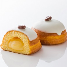 「富士山頂」は老舗和菓子屋「田子の月」のロングセラーの洋菓子です。山型のふわふわのカステラの中に甘くまろやかなカスタードクリームを入れ、雪に見立てたホワイトチョコをかけました。ちょこんと乗ったコーヒー味のチョコビーンズは、なくなってしまった観測所を模したものです。