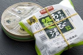 わさび漬けは、塩漬けのわさびに酒粕を混ぜたもの。田丸屋は自社のわさび田を持ち、ベテランによる手作業と最先端のシステムをバランスよく取り入れてわさび漬け作りを行っています。静岡市内3か所の直販店に加え、空港・サービスエリア・駅でも購入できます。