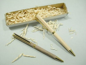 写真はボールペン。1つひとつ手作りで作られ、素材の温かみを感じる商品です。静岡挽物は、静岡駅にある「駿府楽市」で購入できます。