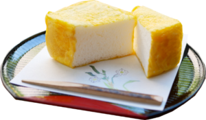 卵の白身をしっかりと泡立てたメレンゲに砂糖やハチミツを入れて寒天で固め、黄身の衣で包んで焼いたもの。一口食べると、卵の風味と甘さが口いっぱいに広がり、空気のように消えゆく儚い口あたりが、昔からながらにして新食感!