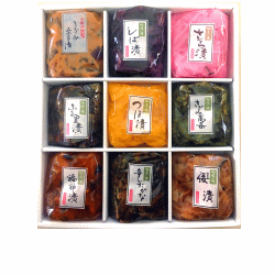 奈良を代表する名物「奈良漬」その、きざみ奈良漬を筆頭に、しば漬、さくら漬、刻みすぐき、つぼ漬、きざみ高菜、福神漬、辛したかな、倭漬の9種類が入った贅沢なセットです。