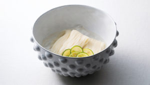 一見、厚揚げのように見える「きみごろも」。江戸時代の建物が残る保存地区で、今なお変わらぬ製法で作られているきみごろもは、見た目は鮮やかな黄色、触れると淡雪のような柔らかさが特徴です。