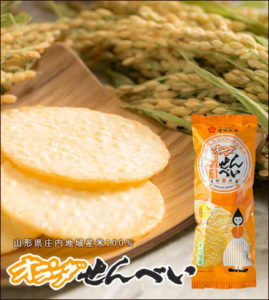 山形県庄内地域産うるち米を100%使用して作った、お米を味わうあっさりサラダ味の「オランダせんべい」。お米の風味をそのまま感じられるよう、精米したてのうるち米をわずか3mmの極薄に焼き上げ、カリッとした食感が楽しいお菓子です。