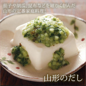 きゅうり、ねぎ、しそ、昆布など、季節の野菜を細かく刻んで漬けた山形の家庭料理。ネバネバが美味しいご飯がすすむ絶妙な味わいが特徴の「山形のだし」です。