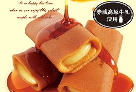 「メープルミルクロールケーキ」はパンケーキ風のスポンジ生地でカスタードクリームを巻いたケーキです。関越自動車道赤城高原SA(下り)限定商品。メープルの香る生地はふわっと・しっとり、とろりとしたカスタードクリームは練乳のような濃厚さです。赤城高原の牛乳を使っているそうです。
