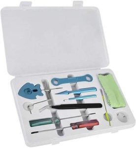 こちらはリールを分解するのに必要な工具が一通り揃っているセット。セット内容は、リールベアリングリムーバー、レンチ、ドライバー、ブラシ、ピンセット、スクリューピボット、ピン、タオル、細いヘッドチューブです。コンパクトで軽量、専用のケース入り。ちょっとしっかりめのリールのメンテナンスや改造をしたいとき、工具を持っていないならおすすめです。