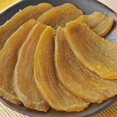 「べっ甲干しいも」は、べっ甲のように美しい仕上がりのとても希少な干し芋です。干し芋は茨城が国内生産量の9割と圧倒的なシェアを誇っています。芋の品種は「玉豊」が中心ですが、「いずみ」種が古くから干し芋の原料として栽培されてきました。しかし加工にたいへん手間がかかることもあり、生産量の少ないのが難点。中でも茨城産は高品質ながらわずかしか流通しません。この「べっ甲干しいも」は茨城産のいずみから作られた干し芋から、とくに糖度の高く出来のよいものを厳選した商品です。そのため生産量が非常に少なくなっています。