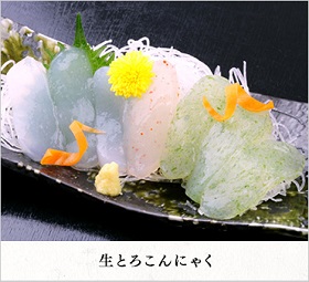 「生とろこんにゃく」は、その名の通りお刺身でいただくこんにゃくです。とにかく普通のこんにゃくと全く違うのが食感!お箸でつかむのが大変なほどとろとろで、歯で噛むまでもなく舌で潰れるほどの柔らかさ。のど越しもつるつる。独特のにおいもなく、まさにみずみずしい生のとろこんにゃくです。プレーンな生とろのほか、青のり風味・唐辛子風味もあり。香りも繊細です。