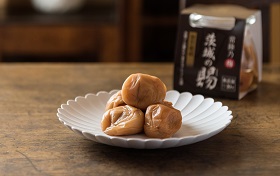 「茨城の賜」は、茨城プレミアム品種の梅「加賀地蔵」で作った梅干しです。茨城県の農家は多品目の作物を栽培しているのが一般的で、梅は加工の手間がかからない青梅を出荷することがほとんどです。しかも自然落果させてしまっていた梅も多数。この「茨城の賜」は地元の梅を有効活用しようと生まれました。加賀地蔵は大粒で薄い皮と柔らかい身が特徴。梅干しにすると濃厚な味わいになります。