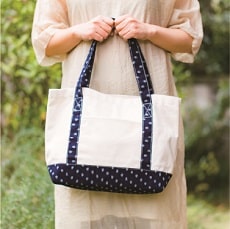 現在は写真のようなバッグやコースター、髪留めなど現代的な商品も作られています。写真は境港市にある「弓浜絣工房B」の商品。弓ヶ浜半島には工房やお土産を扱うお店が点在しています。