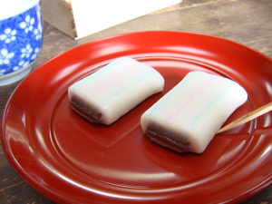 水色とピンクの糸のようなラインが美しい多賀名物。繊細な見た目が乙女心をくすぐる、米粉を使った生和菓子です。小豆から炊き上げた自家製のこしあんを、二度蒸しして柔らかく仕上げた米粉100%の生地でふんわりと包み込んであり、優しく上品な味わいが口いっぱいに広がります。