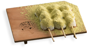 素朴な和の味わいが魅力のお餅お菓子です。串に刺したお餅に蜜をからめ、青大豆と抹茶を合わせたオリジナルの青いきな粉をまぶしたひと品。もちもちのお餅と、蜜ときな粉の素朴なハーモニーが、一度食べると忘れられないおいしさを生み出しています。お餅は一口サイズでぺろりと食べられます。