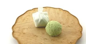 緑色の抹茶粉の下に、和三盆の甘味が効いたやわらかい求肥に包まれた白餡が入っている滋賀の銘菓です。口に入れた瞬間にほろりとほどけるコクのある甘みと、ふわっとほのかに香る抹茶が人気の理由。
