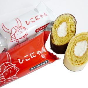 長登屋から出ている「ひこにゃんチョコバウムクーヘン」。チョコレートコーティングされた、クリーム入りのバウムクーヘンで、味はスイートチョコとホワイトチョコの2種類。一口サイズで食べやすく王道なチョコの味わいが子どもも大人も魅了します。