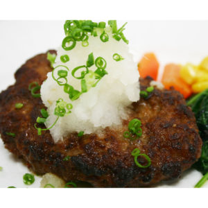 ハンバーグには、温めた大根おろしをのせてポン酢をかけ、その上に刻んだ大葉を載せるだけ。お肉のジューシーさとあっさりした酸味が抜群にマッチし、よりお肉の旨味を感じられるはず。もちろん、お好みでデミグラスソースや煮込みハンバーグでもおいしくいただけますよ。
