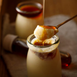 お好みで味の調節ができる「杉樽木桶醤油 シロップ」は、希少な能登産丸大豆の天然醸造醤油に特製のキャラメルソースをブレンドしたもの。口の中でとろっととろける食感と和を感じる新感覚プリンは、子どもも大人も楽しめる贅沢な味わいです。