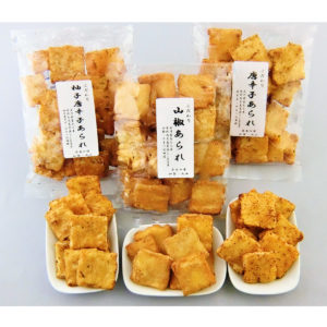 薬味あられ3種(唐辛子・山椒・柚子唐辛子)セット。石川産のお米を二度づきでお餅にし、旨味をそのまま低温熟成乾燥で凝縮させたあられです。噛めば噛むほど、お餅と醤油の味わいが引き出され、口の中で味と香りの変化も楽しめます。