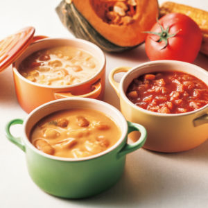 かぼちゃチャウダーはいんげん豆の食感とかぼちゃの甘みが楽しめます。また、コーンチャウダー、トマトチャウダーも野菜たっぷりで、食べ応えのあるスープに仕上がっています。具だくさんの食べるスープは健康志向の方にもおすすめです。