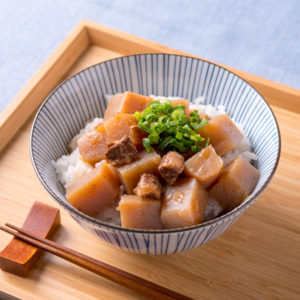 「こんにゃく丼の具」は、錦町特産の生芋こんにゃくに牛すじの旨みがたっぷり染み込んだ美味しいお惣菜です。丁寧に作られた臭みの無い蒟蒻は、弾力のある歯ごたえで、食べ応えも十分!