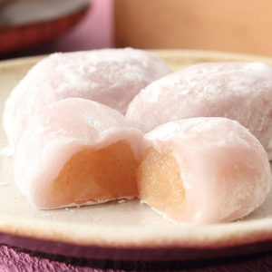 「ふぢ餅」は柚子餡を柔らかな求肥餅で包んだ和菓子です。徳島県石井町の老舗和菓子店「岡萬本舗」の銘菓。1902年の創業時から作られ続けている同店の代表的な商品です。餡には阿波和三盆糖と徳島県産の柚子皮を使い、求肥餅は紫芋で藤色に色付け。石井町の花である藤にちなんでいます。