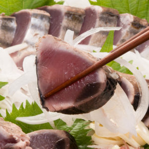 愛媛県愛南町の魚一家が送る、新鮮な「かつおのたたき」。かつおは愛南町の“町の魚”に指定されており、四国一の水揚げ量を誇っています。魚一家は、漁港からほど近い愛南町で水揚げされる魚介類の各種加工を手掛けています。