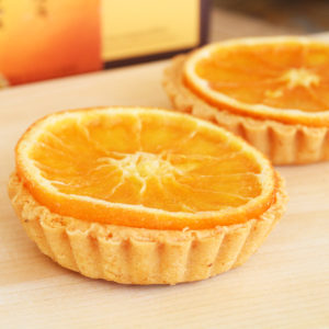老舗洋菓子店「永久堂」の紅まどんなを使ったタルト。タルト生地に程よい甘さのアーモンドクリームを絞り、その上にシロップ漬けにした輪切りの、愛媛の高級柑橘「紅まどんな」をのせて焼き上げたタルトです。