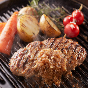 むなかた牛の細挽きと粗挽きの2種類のミンチを使用し、しっかりとした赤身の旨味と程よい甘みのある脂が、食べた瞬間口の中に広がっていく贅沢なハンバーグです。肉汁たっぷりのジューシーな味わいで、子供からお年寄りの方まで幅広い世代に愛される一品。深い味わいを楽しめるむなかた牛でしか味わえないハンバーグを堪能できます。