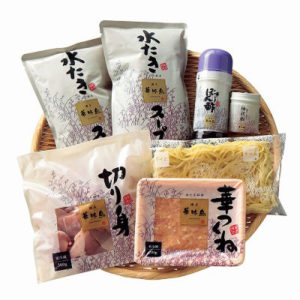 ・内容量…水たきスープ600g×2、華味鳥切り身300g、華つくね200g、冷凍ちゃんぽん麺180g、柚胡椒30g、博多ぽん酢220ml