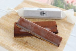 みやざきよかもん市「ときめきスイーツコンテスト」でグランプリを受賞、さらに、ふるさと納税返礼品菓子部で全国ランキング1位に輝いた「フーちゃんの生チョコバー」です。アーモンドが織りなすサクサクとしたクッキー生地と、口の中でとろっととろける濃厚な生チョコレートが2層になったスティック状の生チョコケーキです。