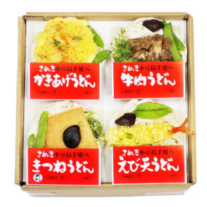 - 内容量…きつねうどん255g(つゆ20ml)×3、かき揚げうどん270g(つゆ20ml)×3、牛肉うどん240g(つゆ20ml)×3、えび天うどん235g(つゆ20ml)×3