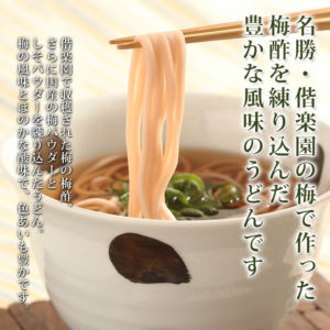 日本三名園の一つである「偕楽園」の梅で作った梅酢を練り込んだ梅うどんです。