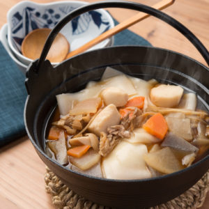 館林うどんの麺は平たく艶があり、つるつるとした喉越しと噛み応えが人気。野菜は群馬県産を主としています。大根・人参・里芋・こんにゃく・牛蒡・舞茸・豚肉・油揚げと贅沢に入った具材が色鮮やかで食欲をそそりますよ。
