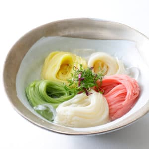 4色のそうめんをお皿に盛り付けると食卓が鮮やかに彩られ、特別な日やお祝い事にぴったり。