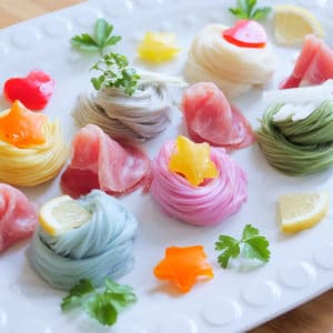 自然素材と天然素材を練り込んで作ったカラフルな見た目はもちろん、細くなめらかな食感も特徴です。