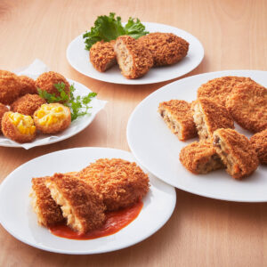 - 内容量…トマトソースで味わう蟹クリームコロッケ2個入り(コロッケ140g、トマトソース23g×2)、黒毛和牛のビーフコロッケ3個入り200g、北海道産とうもろこしのプチクリームコロッケ6個入り180g、肉じゃがコロッケ3個入り180g、ジューシーミンチカツ2個入り150g