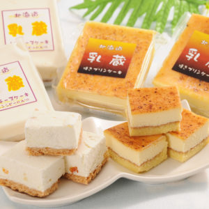 乳蔵レアチーズケーキは、自家製のクリームチーズとオレンジピールの甘酸っぱさが相性バッチリ。乳蔵焼きプリンケーキはほんのり苦く香ばしいキャラメリゼが、自家製のクリームチーズとマッチした他にない味わいの焼きプリンケーキです。