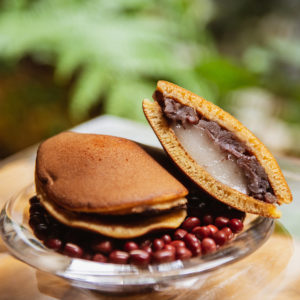 どら焼きは、独自製法で上品な甘さに炊き上げた大納言小豆の大粒の粒あんと求肥をサンド。生地は米粉を使用して柔らかく仕上げられており、もっちりとした食べ応えのある食感が楽しめます。