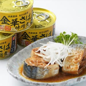 宮城県金華山沖の高級マサバを使用した味噌煮缶詰で、しっかりと脂の乗った贅沢な味わい。
