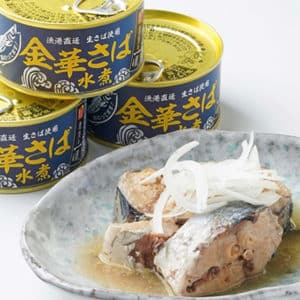 宮城県金華山沖の高級マサバを使用した水煮缶詰で、しっかりと脂の乗った贅沢な味わい。