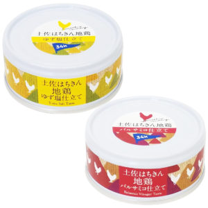 高知県大川村の土佐はちきん地鶏を使った「ゆず塩仕立て」「バルサミコ仕立て」2種類の缶詰。