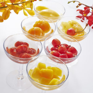 まるごとみかん・白桃・さくらんぼ・フルーツポンチ・まるごとトマト・マンゴーの6種類をそれぞれ155gずつ楽しめるセット。
