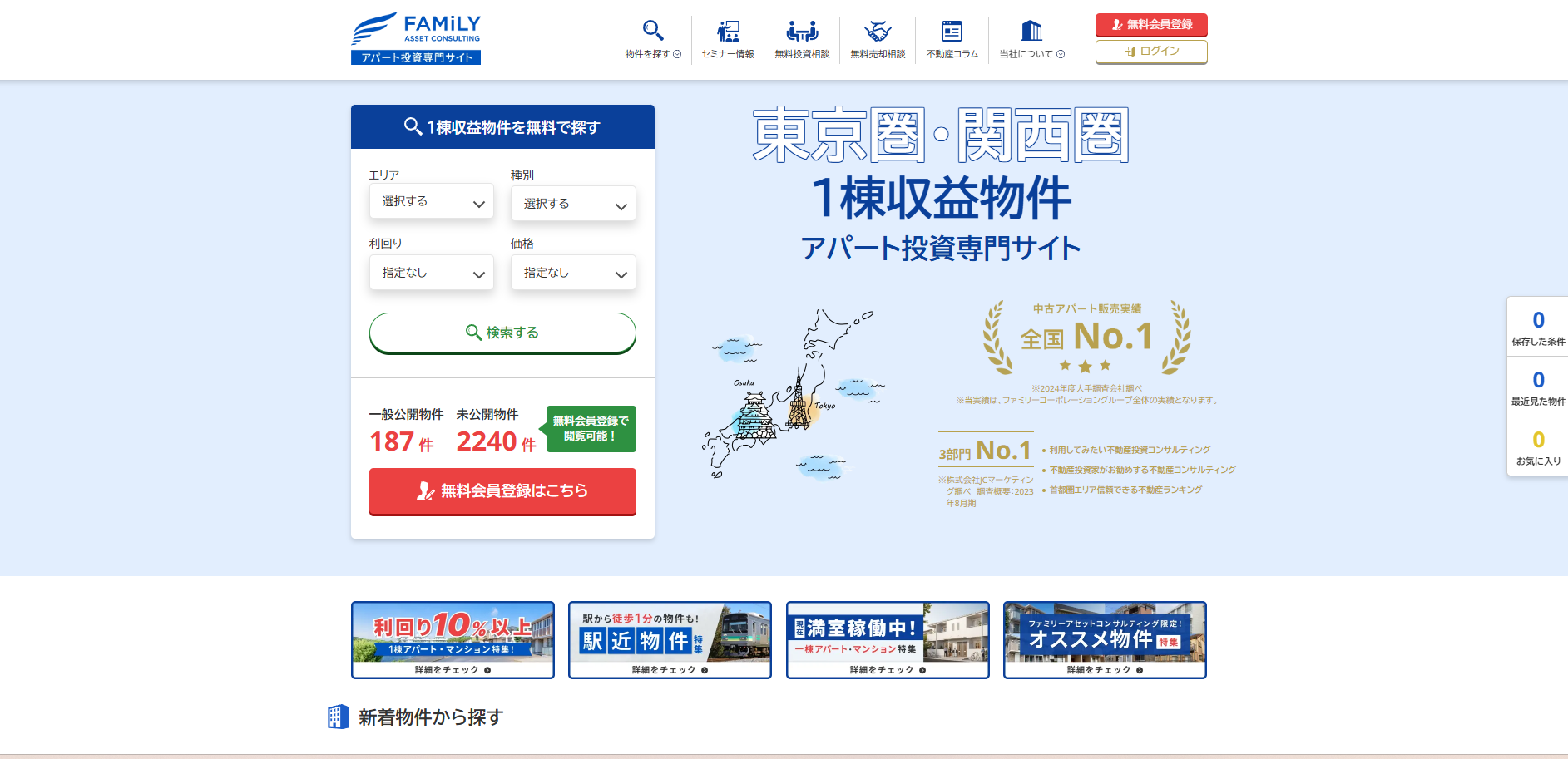 東京・関西を中心とした物件情報のほか、融資や税務に関するアドバイスも提供し、投資家が安心して資産運用できる環境を整えています。初心者から経験者まで幅広く活用できるサイトです。