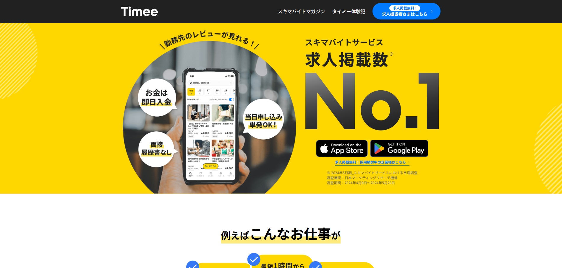 「タイミー」は、スポットバイトのアプリ/サービスとしてはよく知られている定番です。