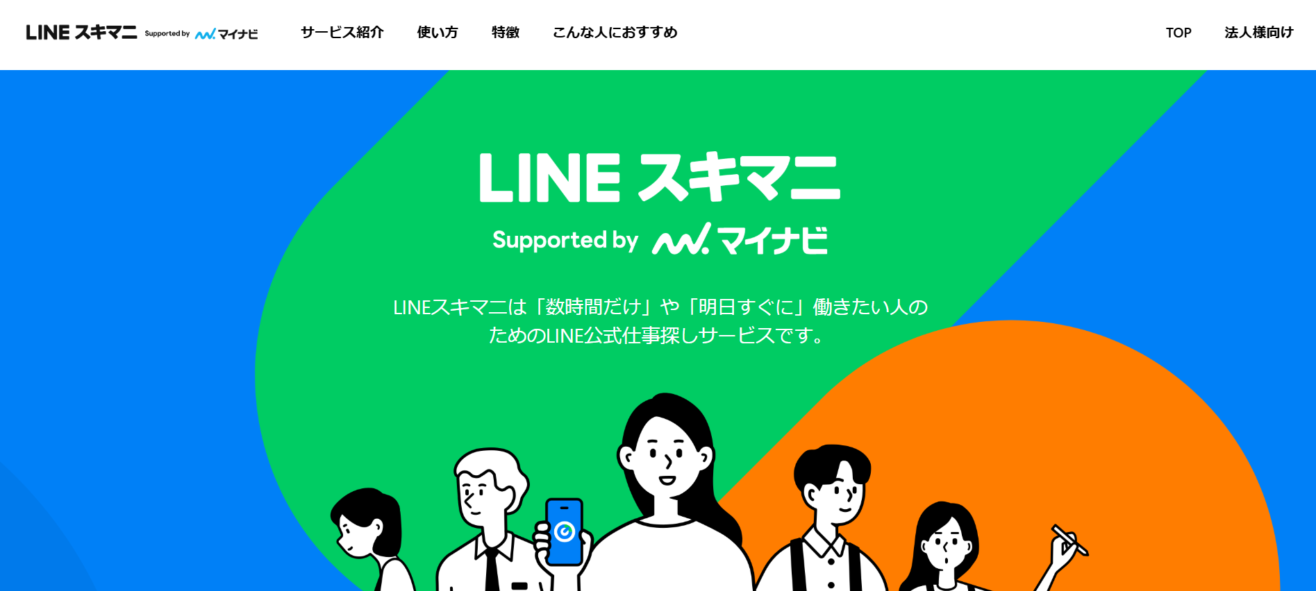 「LINEスキマニ」は、コミュニケーションアプリ大手のLINEが提供する仕事探しアプリ/サービスです。急な空き時間を活用して稼げる単発の仕事が見つかります。