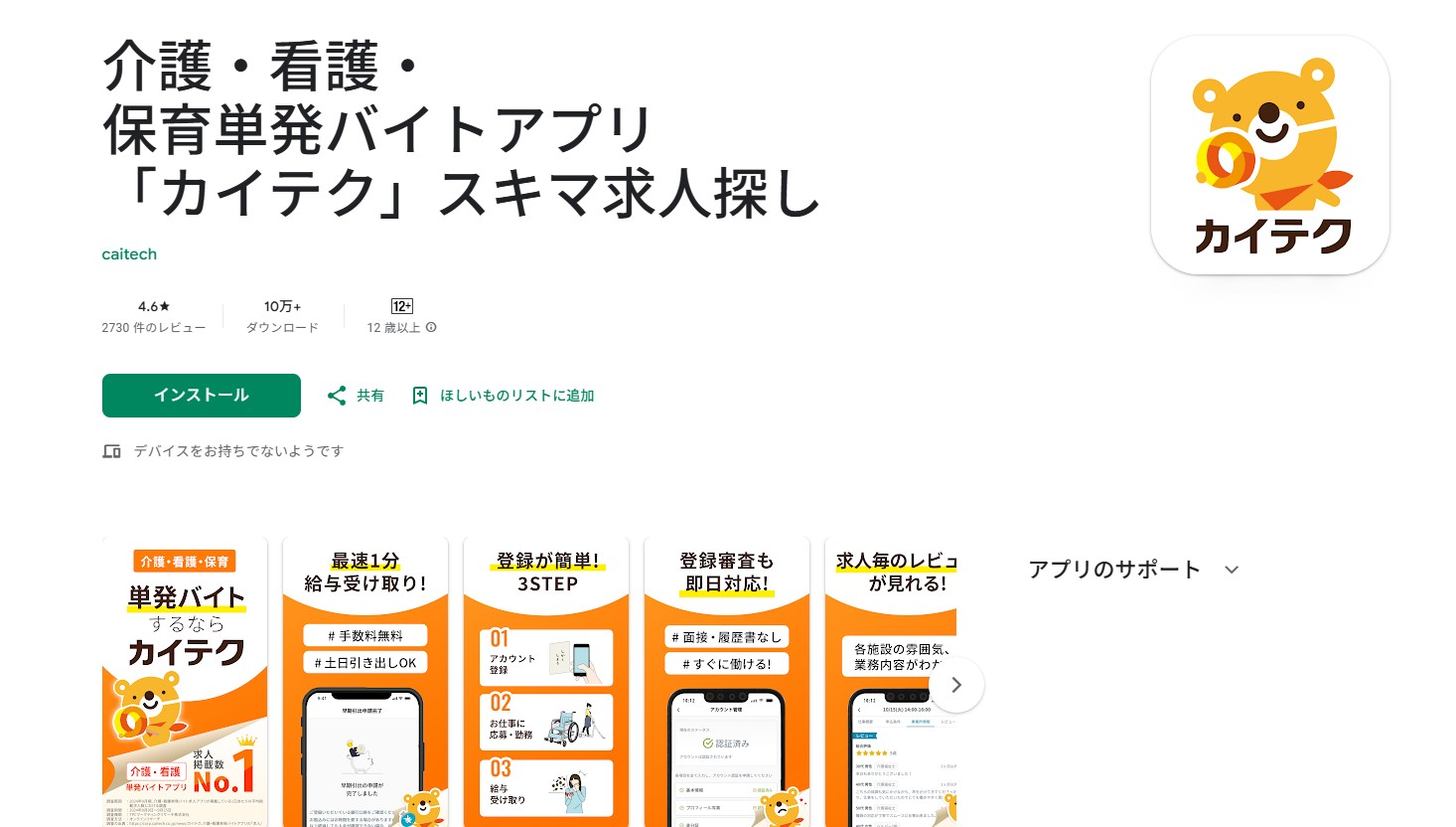 「カイテク」は、介護特化型のスキマバイトのアプリ/サービスです。