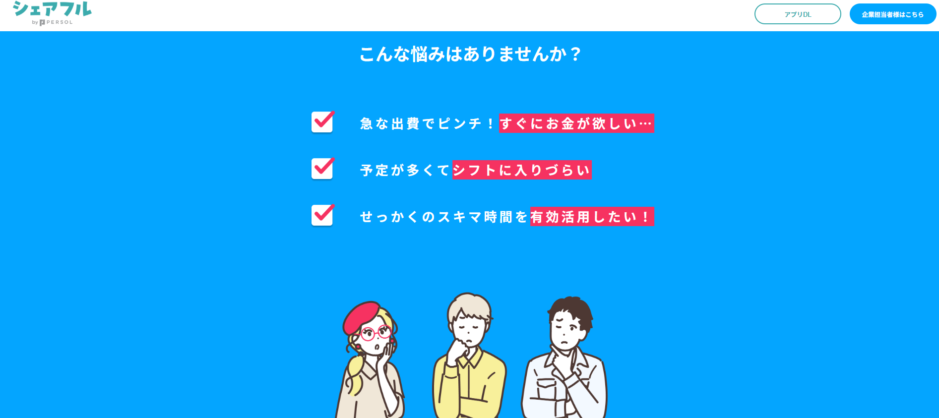 「シェアフル」も代表的なスキマバイトアプリ/サービスです。dodaなどの求人サイトを提供している人材サービス大手のパーソルグループが運営しています。